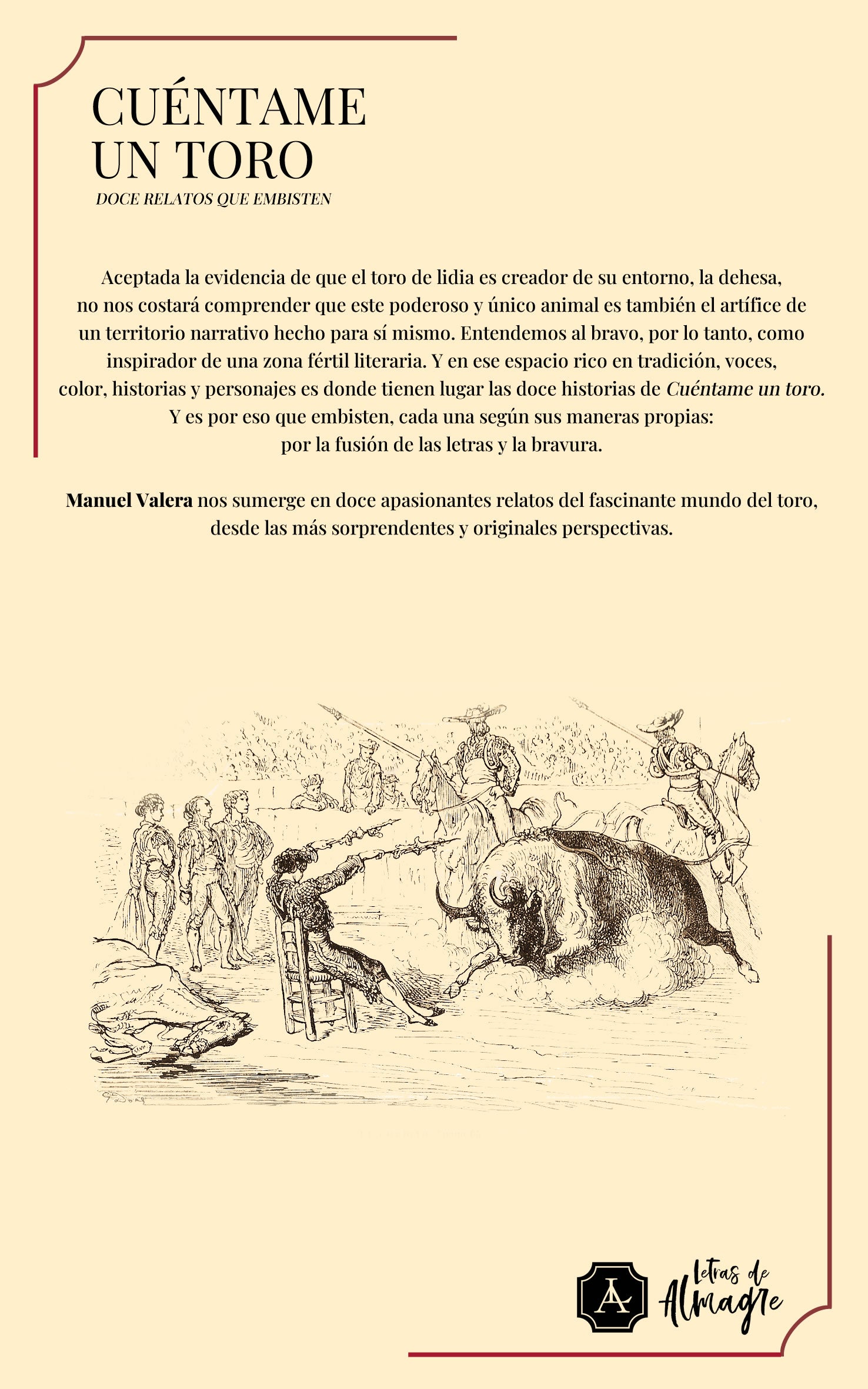 Aceptada la evidencia de que el toro de lidia es creador de su entorno, la dehesa, no nos costará comprender que este poderoso y único animal es también el artífice de un territorio narrativo hecho para sí mismo. Entendemos al bravo, por lo tanto, como inspirador de una zona fértil literaria. Y en ese espacio rico en tradición, voces, color, historias y personajes es donde tienen lugar las doce historias de Cuéntame un toro. Y es por eso que embisten, cada una según sus maneras propias: por la fusión de las letras y la bravura. Manuel Valera nos sumerge en doce apasionantes relatos del fascinante mundo del toro, desde las más sorprendentes y originales perspectivas